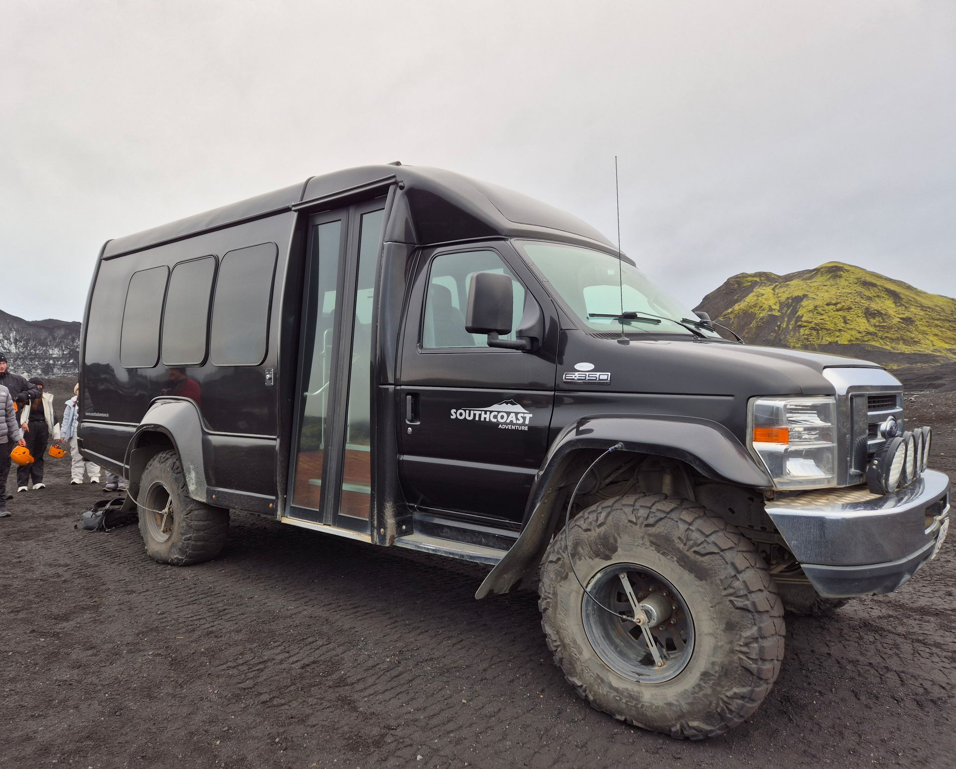 各々ランチを済ませた後ヴィークからはSouthcoast Adventure社のスーパージープに乗り換えます。ヴィークまでドライブしてくれたアークティックアドベンチャーズのドライバーガイドさんが見送ってくれます。このドライバーガイドさんは私達がアイスケーブに行っている間はヴィークで待機し、アイスケーブツアーが終わった後にまたアークティックアドベンチャーズのミニバスに乗り換えレイキャビクに帰る流れとなります。(ここからはトイレは無いのでヴィークで必ず済ませておくように。)また今回ヴィークからの参加者が3名いたのでレイキャビクからの9名+3名=12名とドライバーガイドさんでカトラアイスケーブに行きました。