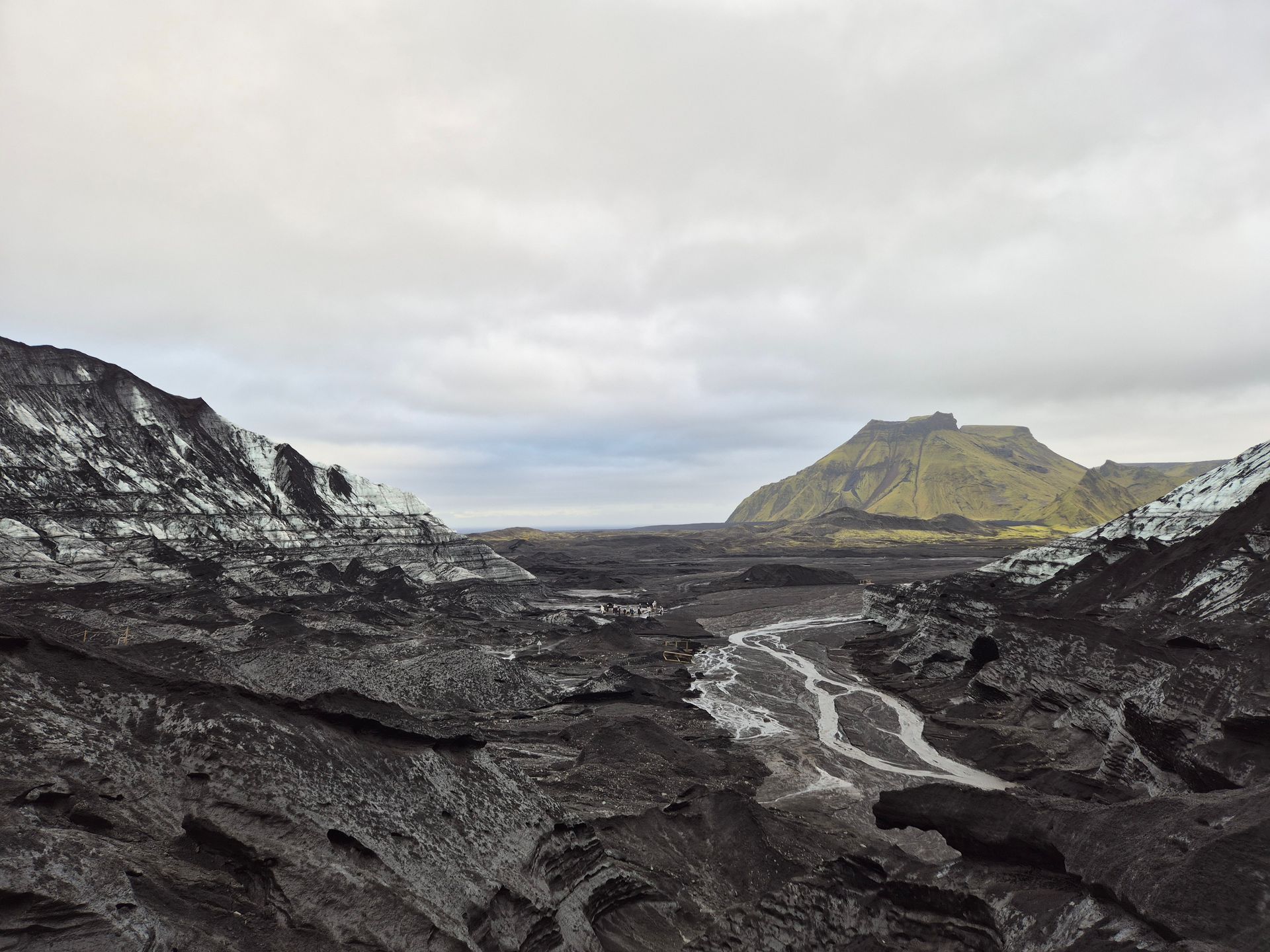 スーパージープを降りた時の眺めです。別世界にやって来ました。ジープを降りるとこのような景色が広がっています。このMyrdalssandurというエリアは映画ローグワン・スターウォーズストーリーにも出てきます。辺り一面の黒い砂は1918年にカトラ火山が噴火した際に起こった氷河洪水で運ばれた火山灰や堆積物の土砂です。氷河の下にあるカトラ火山に現在活動が見られ、このエリアでは時々地震が起こっているので、近い将来噴火と氷河洪水がまた起こってもおかしくない場所です。これから真冬は一面白い雪景色となると思いますが、訪れた日はまだ雪はなく黄緑の苔の生えた山、氷河と黒い砂地のコントラストが見られました。