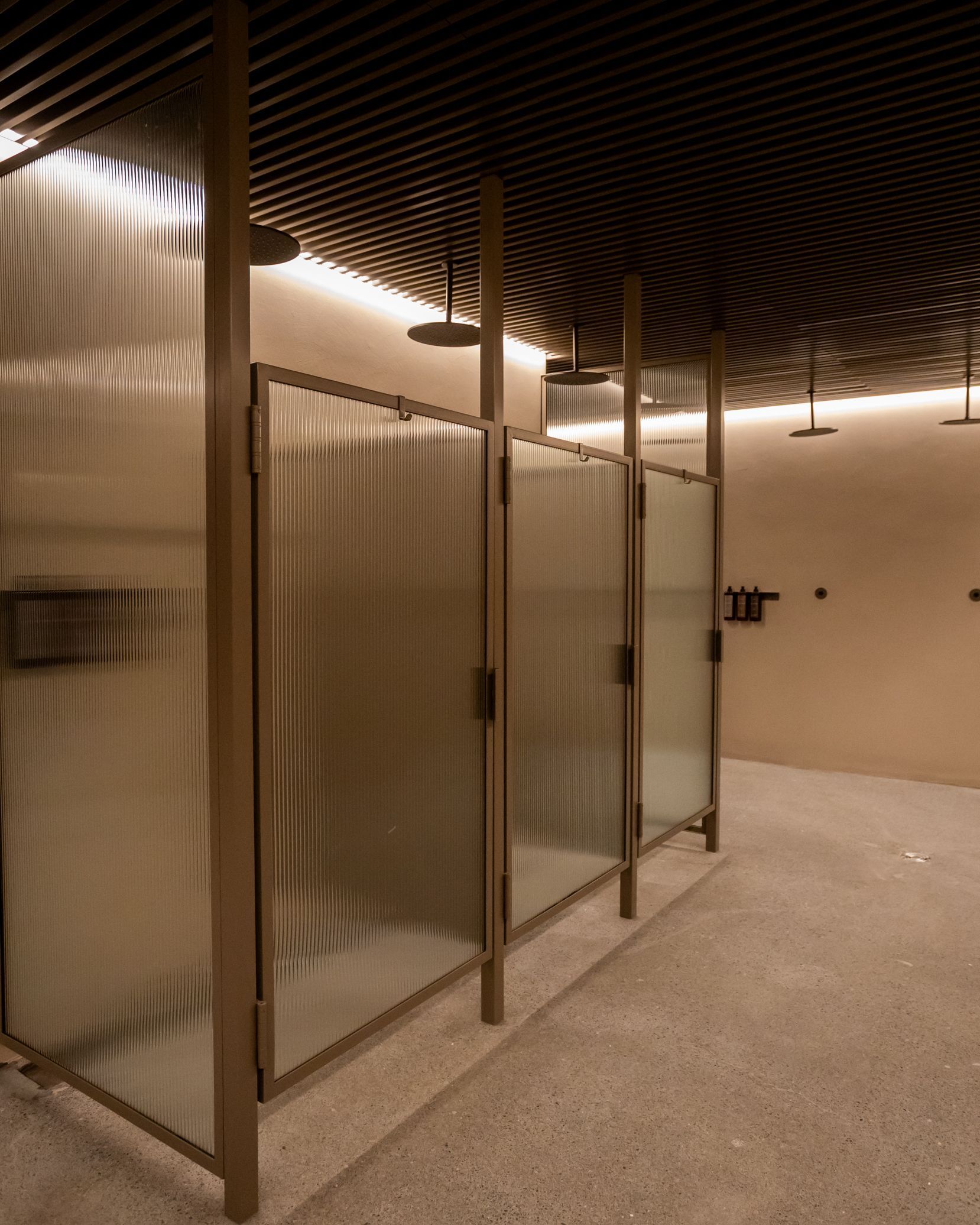 服を脱いで、服や持ち物をロッカーに入れ、リストバンドでロックした後は、水着とタオルを持ってシャワーエリアに向かいます。