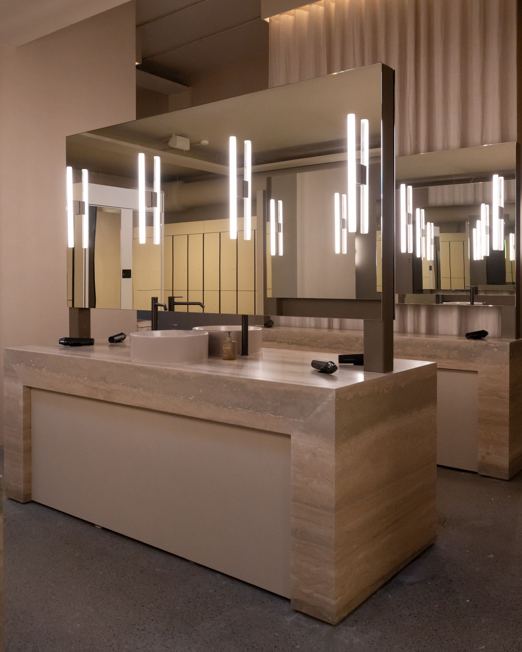 写真のように更衣室内にドライヤーは完備されています。ロッカー前のスペースでオープンに着替えるようになっていますが、個室で着替えたい方は個室もあるのでご利用頂けます。